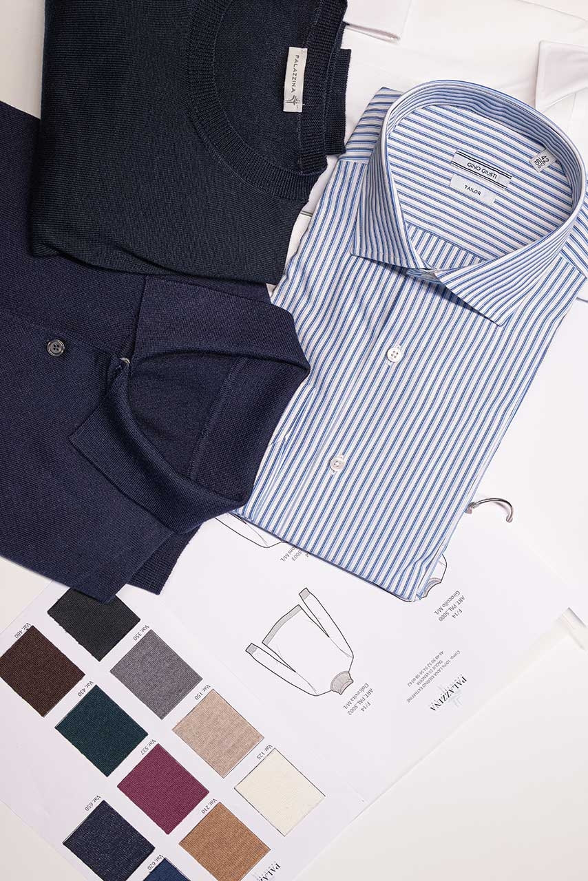Il servizio su misura viene supportato da un kit professionale di capi test per la rilevazione precisa delle misure, successivamente archiviate per garantire continuità e rapidità nelle future richieste. Un espositore dedicato presenta l’ampia varietà di colli e polsi disponibili, mentre un book esclusivo guida nella scelta tra i migliori tessuti.